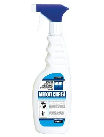 МЕГОЛ СПРЕЙ средство для для очистки от нагаров кухонных плит, грилей, духовок, печей, противней и другого пищевого оборудования, посуды и столовых приборов, для мойки и обезжиривания твердых щелочестойких поверхностей.