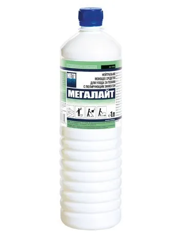 МЕГАЛАЙТ нейтральное моющее средство с полирующим эффектом для ручной и машинной чистки и ежедневного ухода за полами с полимерным или лакированным покрытием, паркетом, ламинатом, линолеумом, керамической плиткой, полами из натурального или искусственного камня и другими водостойкими поверхностями.
