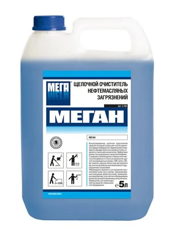 МЕГАН среднепенный щелочной очиститель нефтемасляных загрязнений для очистки различных твёрдых поверхностей, деталей машин и механизмов, транспорта, ручной и машинной мойки любых наливных, бетонных и полимерных полов, керамической плитки, линолеума, натурального и искусственного камня, любых металлов и прочего.