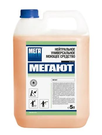 МЕГАЮТ высокопенное нейтральное моющее средство для ручной мойки и очистки любых твердых поверхностей, полов с полимерным или ламинированным покрытием, линолеума, паркета, керамической плитки, натурального и искусственного камня, пластмассы, окрашенных, лакированных, стеклянных, металлических, кожаных и других поверхностей.