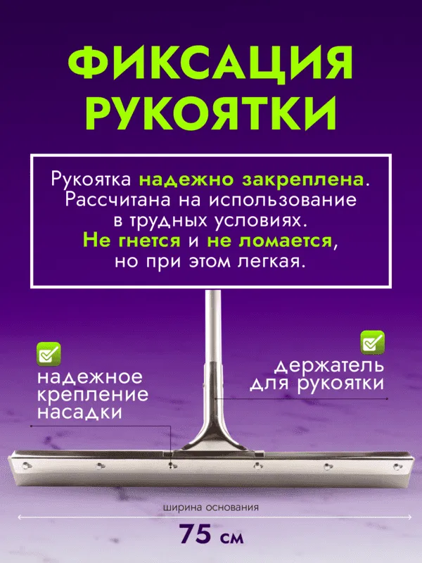 Сгон эффективно удаляет с поверхности пола жидкость. Относительная массивность рамы способствует плотному прилеганию резиновой насадки к поверхности пола, препятствуя утечке собираемой жидкости.