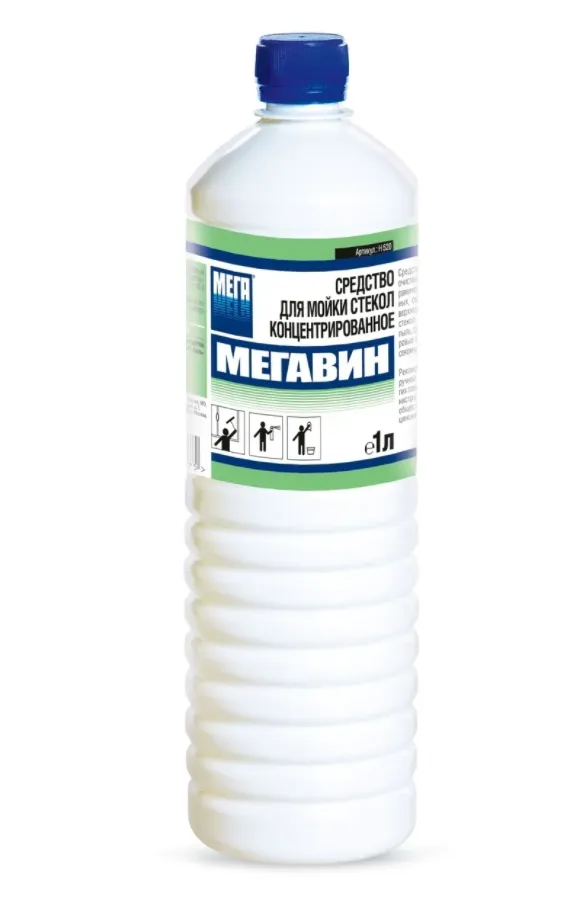МЕГАВИН прозрачная однородная жидкость голубого или бирюзового цвета для очистки окон, зеркал, витрин, керамических, пластиковых, металлических, окрашенных и других поверхностей, а также для мойки стекол автомобилей.
