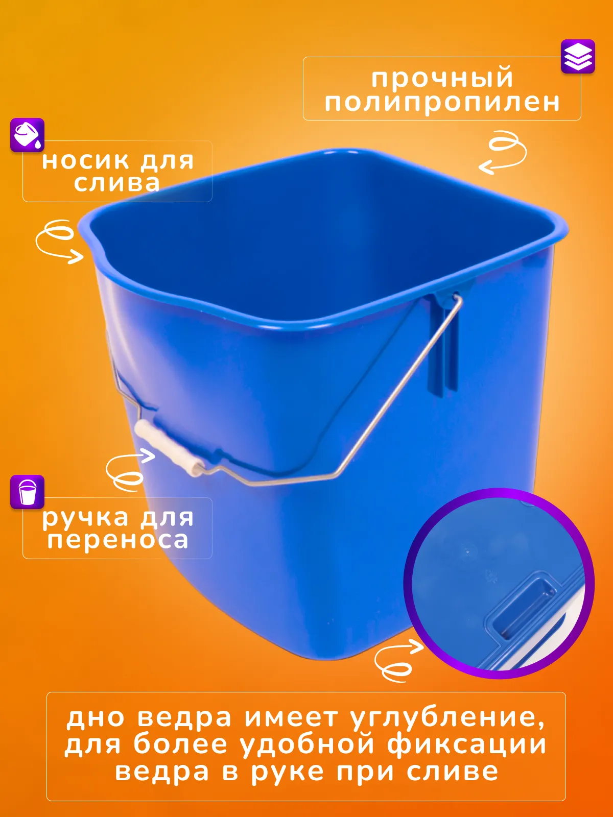Ведро выполнено из полипропилена и имеет эргономичную рукоятку с удобным захватом. Цвет синий.