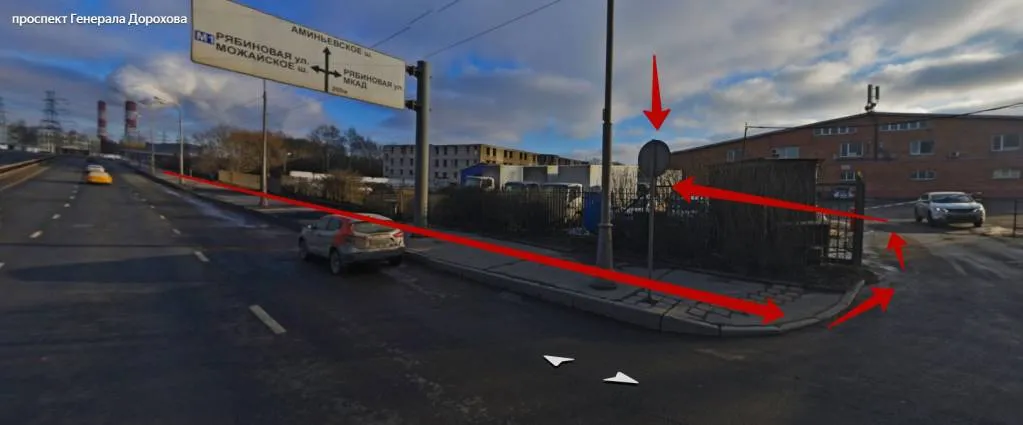Перейдя пешеходные переход двигайтесь по тротуару около 500 метров до въезда со шлагбаумом на территорию.