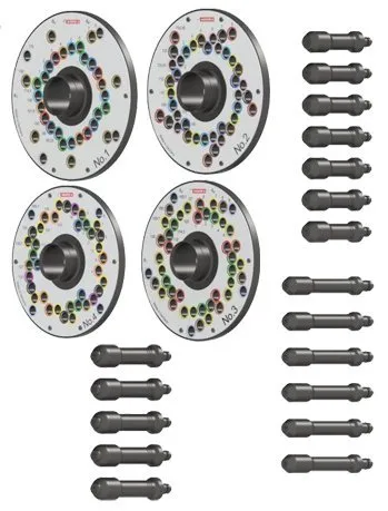 Набор состоит из: 4 плиты фланцевых адаптеров FlangePlate с цветовым обозначением отверстий, 3 комплекта пальцев и настенного дисплея с кронштейнами для хранения адаптеров.