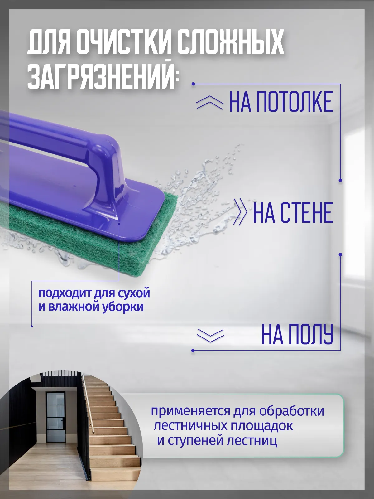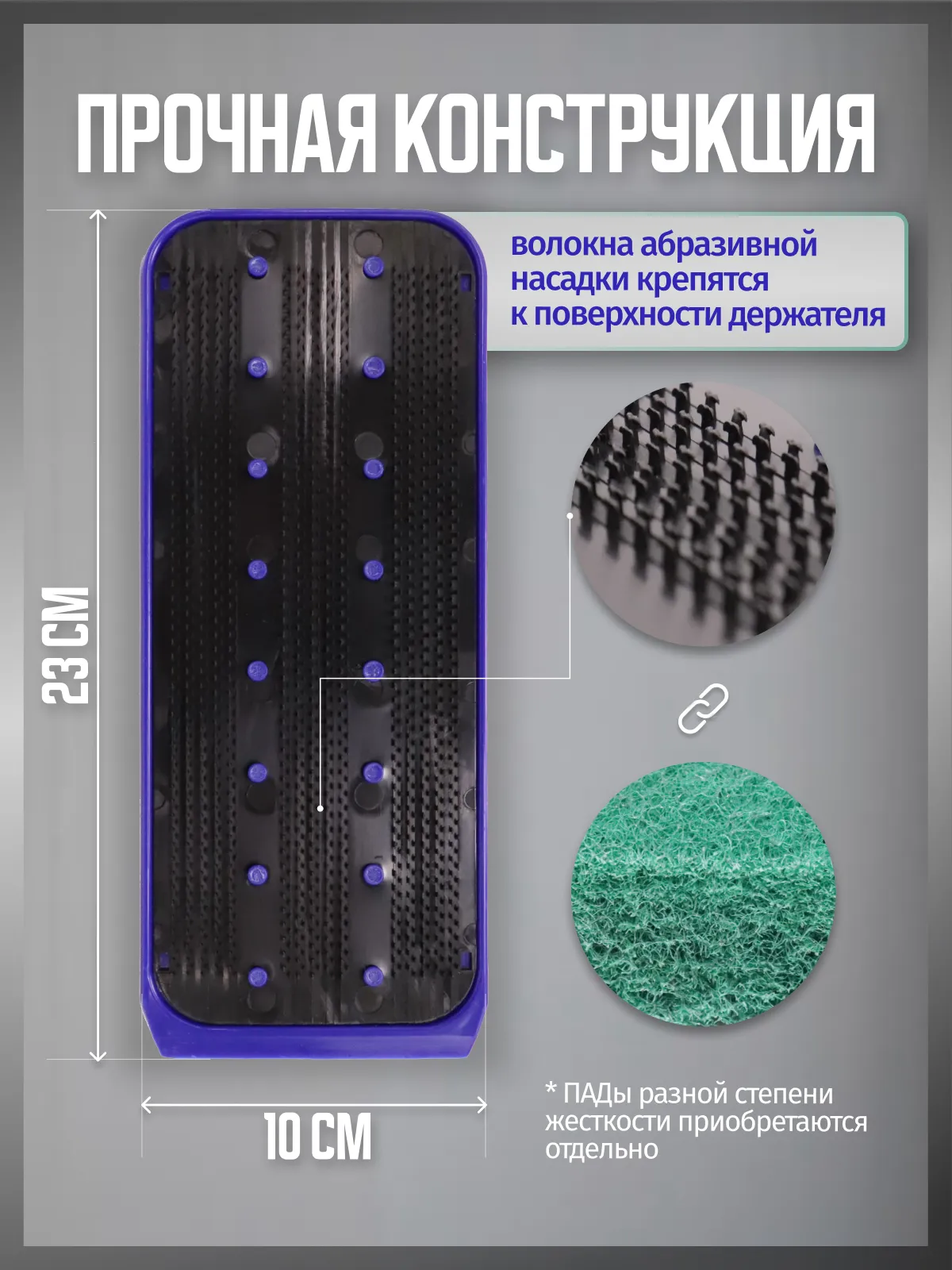 Держатель предназначен для крепления чистящих насадок из абразивного материала - падов, которые используются для очистки поверхностей с твердым покрытием в местах скопления трудно удаляемой грязи, наиболее часто применяется для обработки лестничных площадок, ступеней лестниц и углов помещений. Может применяться для очистки стен.