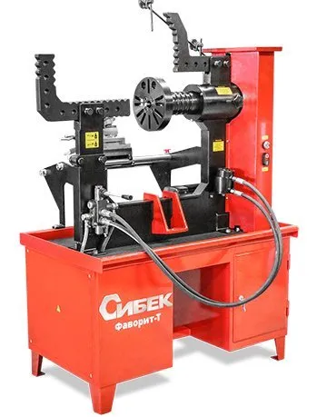 Ремонтируемый диск закрепляется на планшайбе, группа пазов которой позволяет зафиксировать любой диск вышеуказанного размера. Гидравлический привод стенда «Фаворит-Т» позволяет достигать максимального усилия в зоне правки до 5000 кг, что, в большинстве случаев, позволяет полностью восстановить геометрию ремонтируемого диска. «Фаворит-Т» комплектуется сменными рихтующими насадками и рабочими штоками, предназначенными для исправления повреждений различного вида. Управление рабочим гидроцилиндром осуществляется при помощи гидравлического распределителя со встроенным редукционным клапаном и регулятором давления.