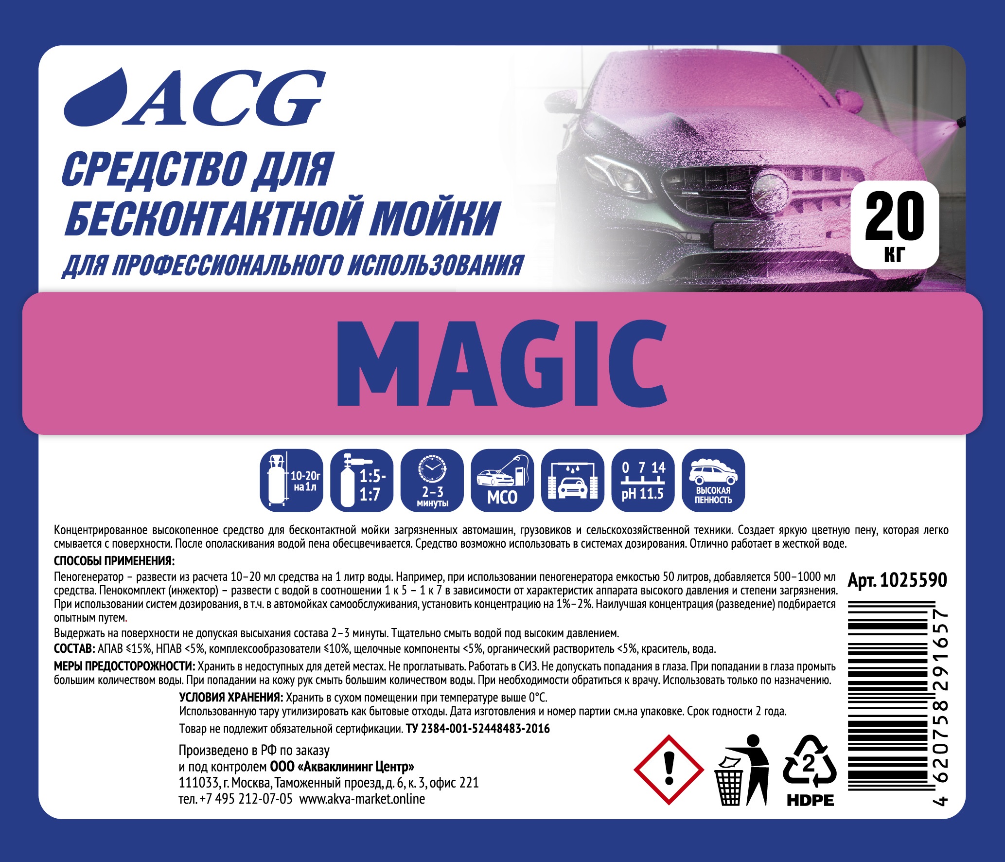 Концентрированное высокопенное средство для бесконтактной мойки загрязненных автомашин, грузовиков и сельскохозяйственной техники. В процессе нанесения на кузов пена меняет цвет. Средство возможно использовать в системах дозирования. Отлично работает в жесткой воде.