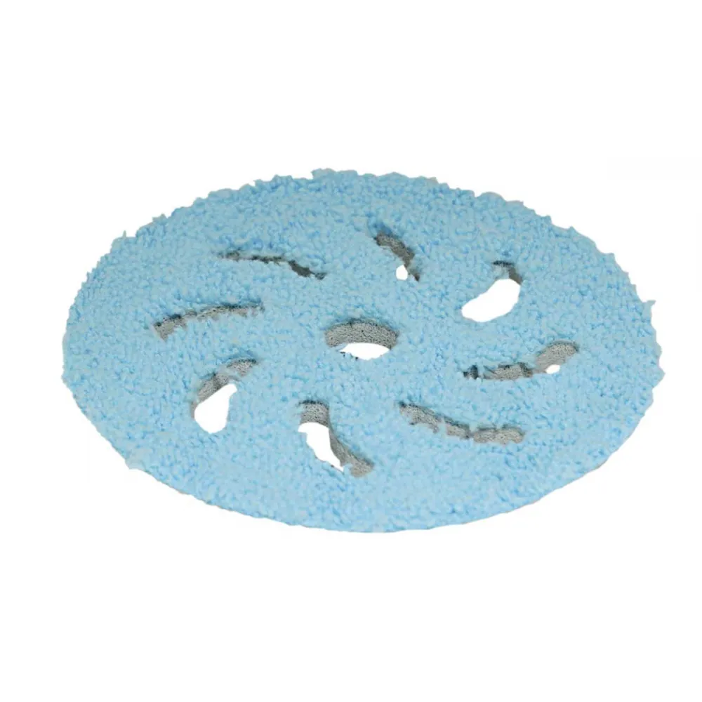 Диск имеет восемь радиальных продолговатых отверстий и одно круглое по центру, рабочая поверхность изготовлена из микрофибры в виде коротких и плотных волокон. Подобное конструктивное решение полировальных дисков способствует стабилизации балансировки, обеспечивает циркуляцию воздуха и рассеивание тепла без перегрева, равномерное распределение пасты по поверхности и их экономное использование.
