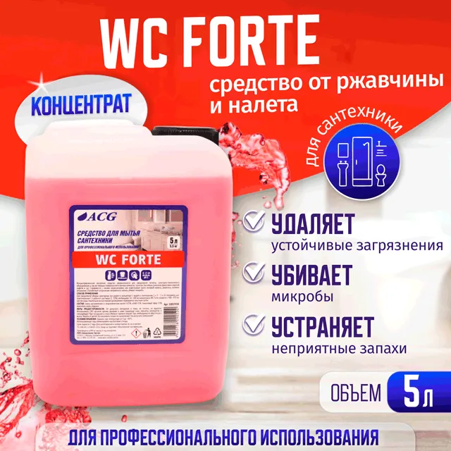 Средство для чистки сантехники ACG WCForte предназначено для удаления сложных комплексных отложений, ржавчины, водного и молочного камня, накипи, извести, масел, жиров, протеинов с кафельной поверхности, сантехнического фарфора и поверхностей из нержавеющей стали, а так же с других стойких к кислотным очищающим средствам поверхностей для мытья раковин, унитазов и ванн.