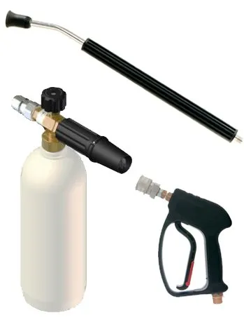 Пенокомплект (пенная насадка), применяемый на аппаратах высокого давления, предназначен для бесконтактной мойки и позволяет наносить химические средства в виде пенного раствора на различные поверхности. Сетчатый фильтр (пенная таблетка), встроенная в сопло насадки, обеспечивает качественную, стойкую пену для более длительного воздействия на грязь