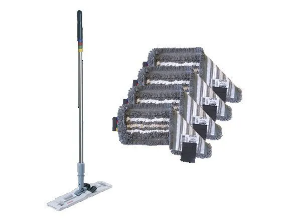 Наличие сменного комплекта помогает в избегании перекрестного заражения, если нужно обеспечивать должный уровень гигиенической чистоты. Этот тип крепления особенно удобен для персонала, чтобы реже контактировать с использованным мопом.