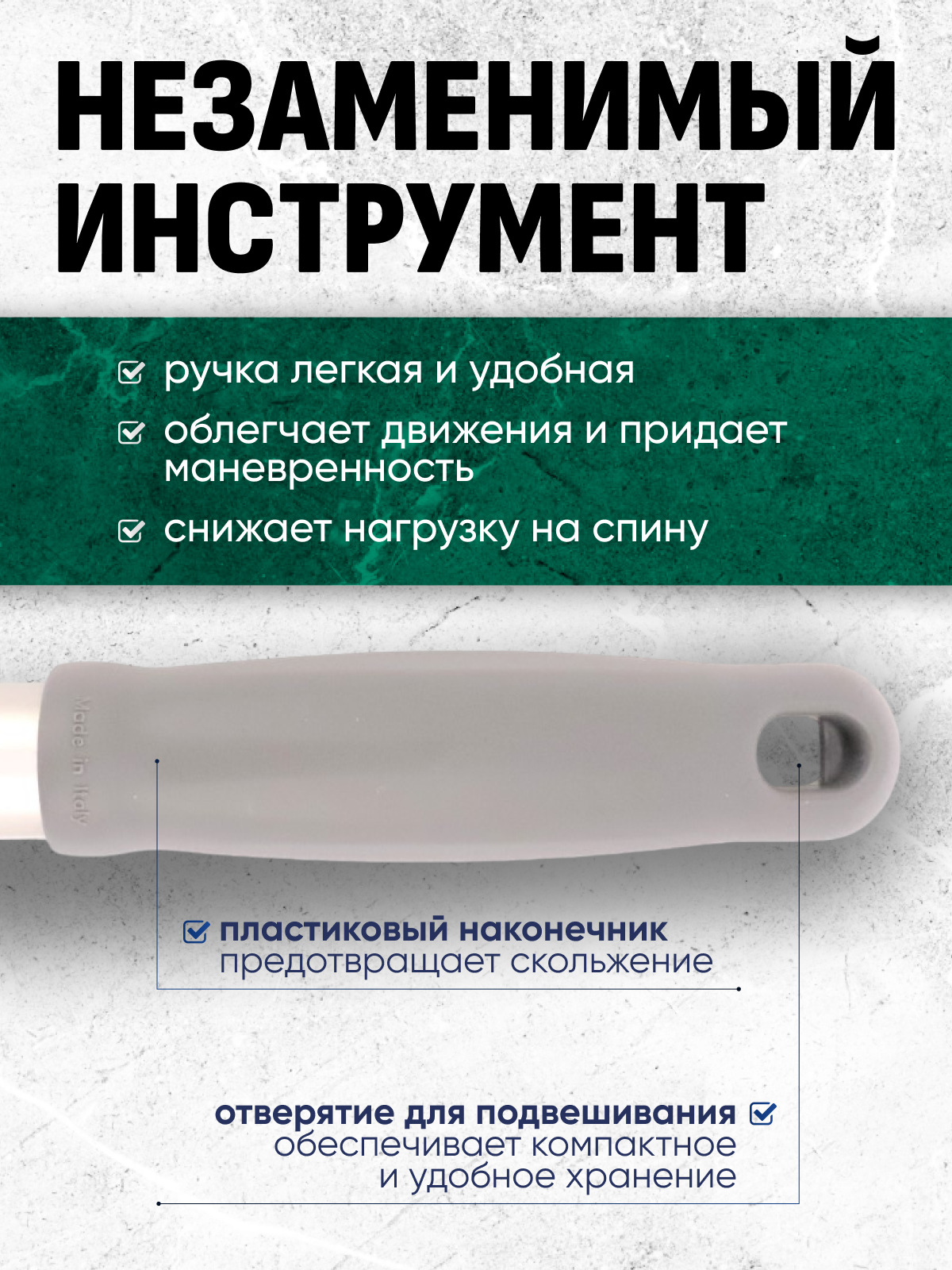 Универсальная алюминиевая рукоятка ( ручка) 140 см. без резьбы. Легкая, прочная, удобная ручка из алюминия для крепления флаундеров, щеток, сгонов и другого инвентаря для уборки пола. Фиксатор инвентаря вставляется в специальное небольшое отверстие на конце алюминиевой ручки. Таким образом, обеспечивается прочная фиксация ручки и инвентаря. На другом конце ручки эргономичная пластиковая накладка-держатель. Цвет серый. Обеспечивает надёжный контакт с рукой пользователя во время работы.