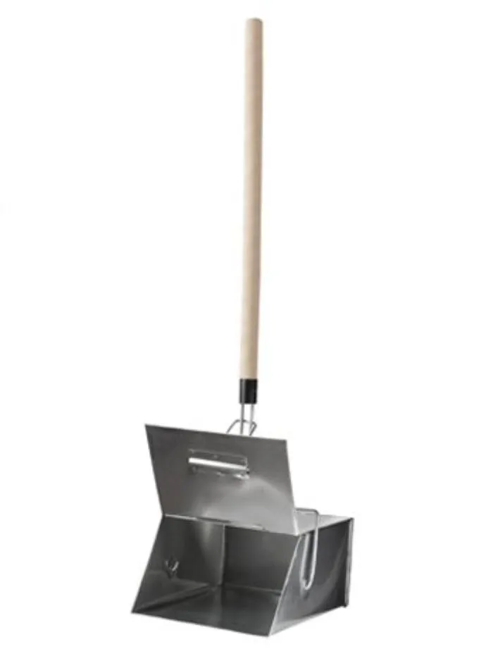 Контейнер совка-ловушки изготовлен из прочной оцинкованной стали, который подвижно закреплён на металлических направляющих присоединённых к длинной деревянной рукоятке.