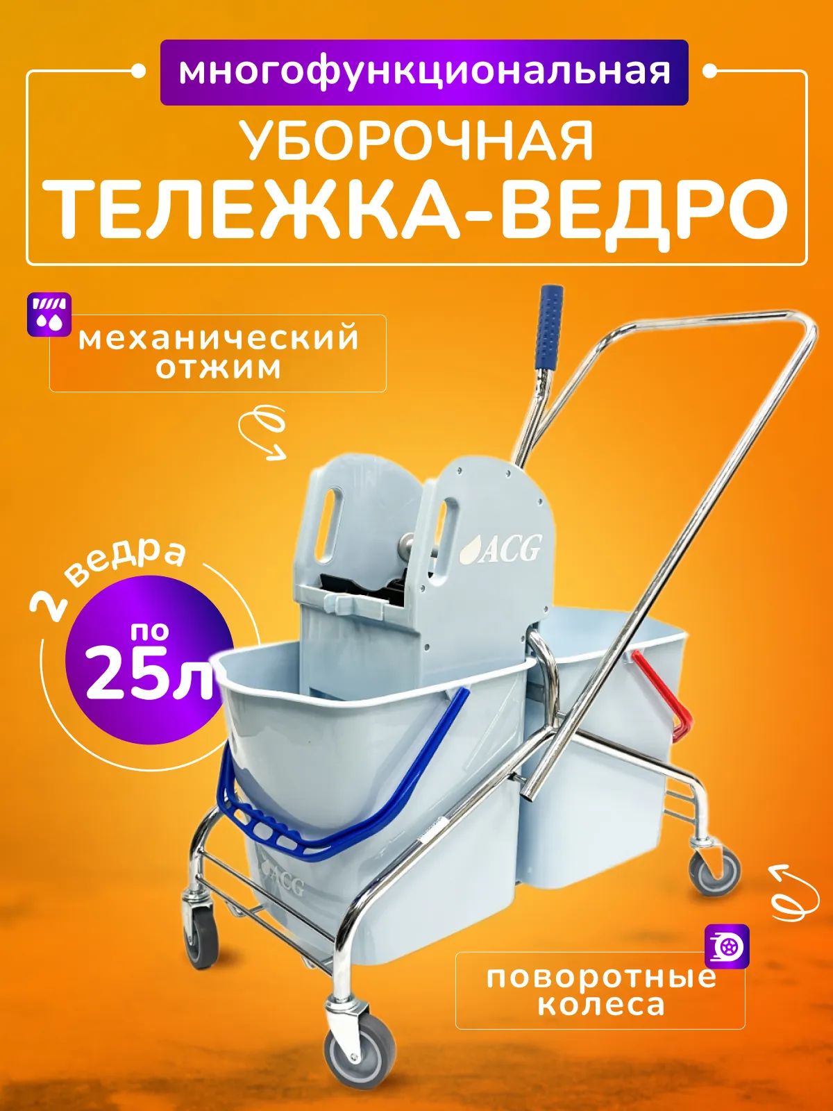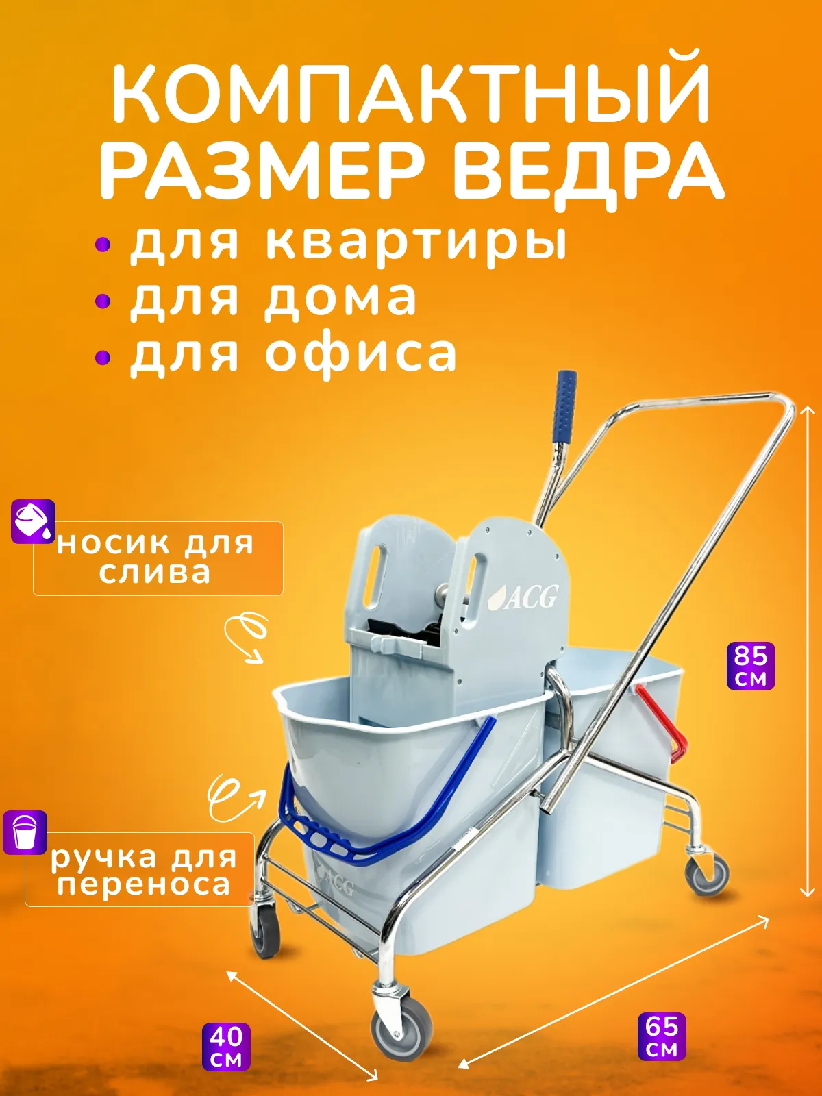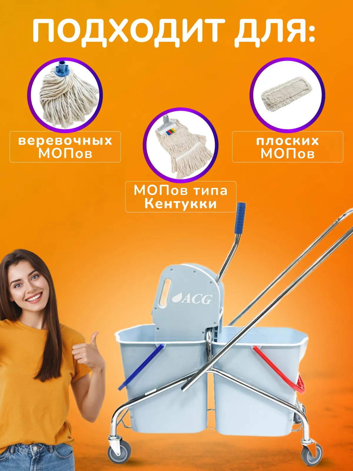 В комплект входит 2 пластиковых ведра и механический отжим для плоских и верёвочных мопов. Отжим оснащён держателем для швабры.