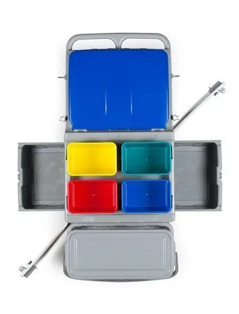 В комплект входит 1 пластиковое ведро 20 литров, и 4 пластиковых ведра по 4 литра для различных моющих растворов, два лотка. Тележка легко перемещается, компактна и удобна в эксплуатации.