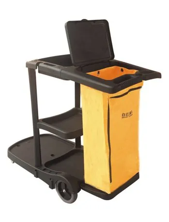 Тележка имеет пластиковую раму с колёсиками, два неглубоких лотка, один для протирочных материалов, другой для клининговых растворов и средств, раму с крышкой и поддон для мусорного мешка.