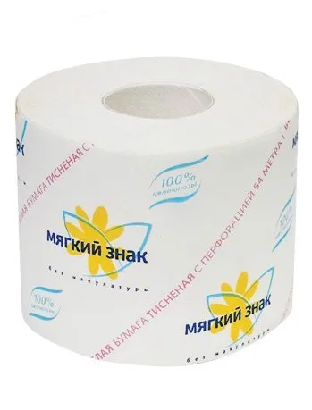 Однослойная туалетная бумага в рулоне в упаковке, с перфорацией и тиснением, изготовлена из 100% целлюлозы, экологичного материала, исходным сырьём для которого является древесина.